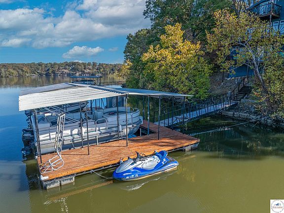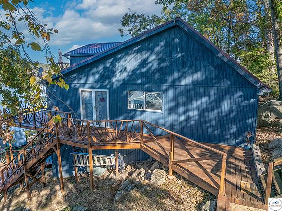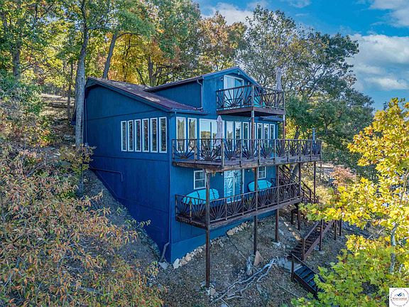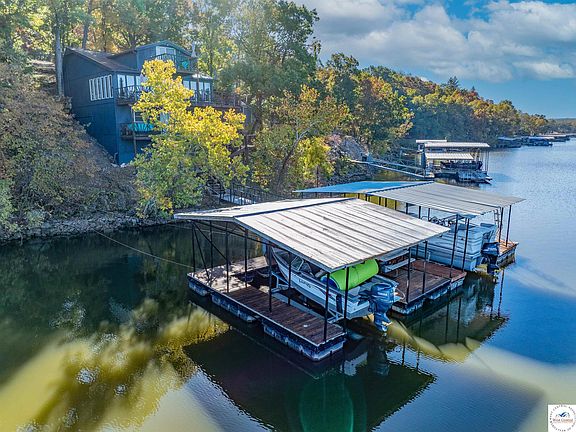 Discover the allure of lakeside living with this remarkable waterfront property at the Lake of the Ozarks. This charming home offers serene waters, breathtaking views, and endless opportunities for relaxation and recreation. Upon entering the main level, you'll be captivated by a stunning wall of windows that perfectly frame the picturesque lake scenery. The spacious kitchen is a culinary enthusiast's dream, boasting ample storage and generous counter space. The inviting living room features an open view of windows and a walkout to the main level deck, where you can savor the fabulous water views. The main level also includes a large dining area and a versatile bonus space currently used as an office, which has previously served as an additional bedroom. The bathroom is well-appointed with a full shower and ample space for a vanity sink and toilet. This open-concept floor plan on the main level ensures everyone can enjoy each other's company, whether you're watching TV in the living room, cooking in the kitchen, or working in the office. The upper and lower levels each offer expansive bedrooms, with balcony decks extending from all three levels, providing the perfect spot to soak in the tranquil surroundings. Head down to the private boat dock, ideal for fishing, swimming, or simply lounging by the water. The dock features two slips, two lifts, a sun deck, a storage building, and wet steps into the water. Situated in a peaceful and serene section of the lake, this home is just a short boat ride away from local dining spots and gas docks, including the popular Rick's Oar House and Shooters 81. The property also includes a versatile storage building that can be transformed into a he shed or a she shed, perfect for lawn tools and additional storage. A convenient parking area at the upper portion of the lot provides ample space for several cars. Located just about 2 hours from Kansas City, this property is nestled on the calm water side of the Lake of the Ozarks. There's so much to love here! Don't miss the chance to make this your dream lakeside retreat!