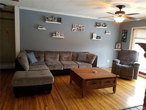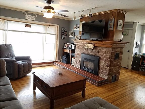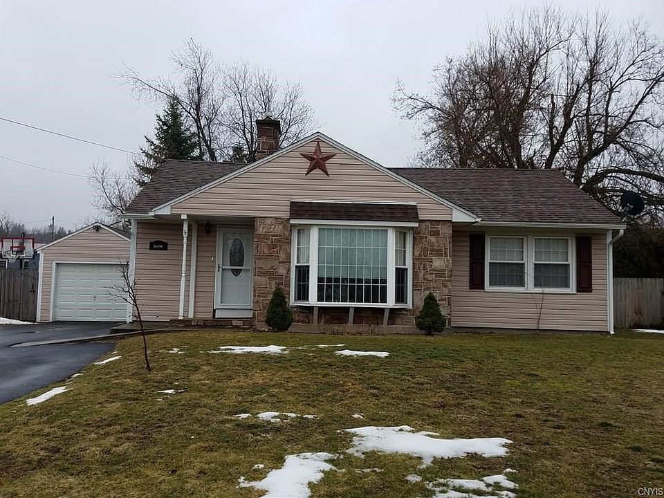 Turn key lovely ranch with central air conditioning, beautifully refinished hardwood floors throughout and massive fireplace adds charm to this modern home with galley kitchen. Other improvements feature a completely remodeled bath with a seamless tub and tiled floor. The basement has an expansive second living room with bar. The private back yard is appointed with a fully fenced yard and full length porch for family get togethers. The owners have also installed new interior doors and energy saver exterior front and back door. They just updated the furnace and installed an automatic garage door opener. All this and only 5 minutes from Fort Drum and the city. Call today for a private showing. Listing provided by Hefferon Real Estate (HEFF01)