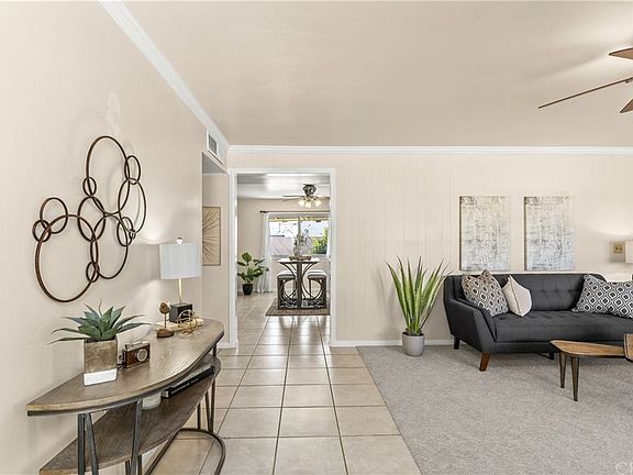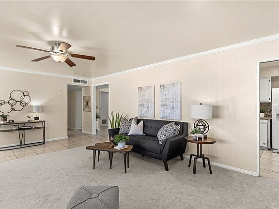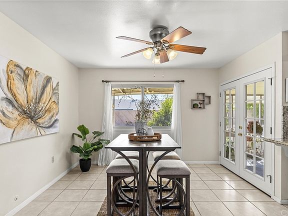 This beautiful home features 3 bedroomS & 2 bathS, 2 car garage and is located in a 55+ retirement community of Menifee in a quiet neighborhood. Great floor plan, Primary bedroom with ensuite offers fresh carpet, french doors to access the desert scape backyard under the cover patio allows for a perfect opportunity to relax, the secondary bedrooms are large insize & fresh carpet in 1 room & wood like flooring in the other. Open floor plan kitchen is bright & airy with granite counter tops, dining room offers french doors adjacent to the covered inside screen patio, large size family room, inside laundry with lots of space and cabinets, recess lighting, ceiling fans, dual pane windows. Mature Citrus trees and low maintenance desert landscape. One storage room adjacent the garage & a additional shed in the back yard.
