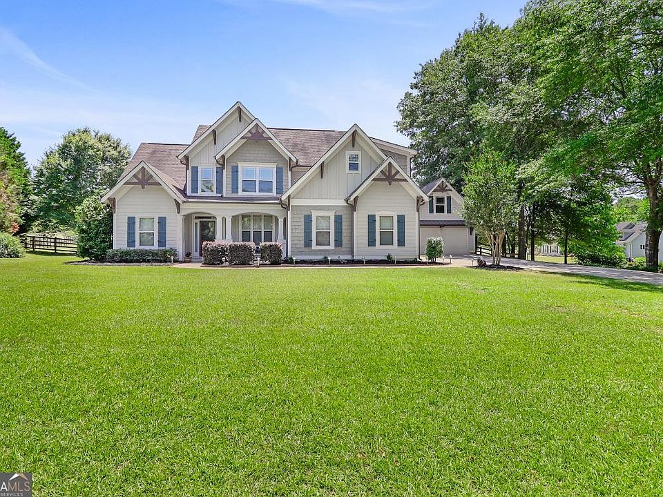 **Motivated seller! Now offering $5000 in closing costs***Immerse yourself in captivating charm with this stunning home featuring beautiful architectural details and a flowing floorplan designed for modern living. Step inside and be captivated by the true Craftsman details. Transom windows and intricate moldings throughout showcase meticulous attention to detail, while the well-laid-out floorplan maximizes every square foot of space for ultimate livability. The open floor plan seamlessly connects the living areas, offering a light and airy feel that flows from formal dining room to the vaulted family room with cozy fireplace. The kitchen has granite countertops, stainless steel appliances, and a breakfast bar and eat-in area for casual meals. Unwind in the spacious main-level master suite boasting gorgeous tray ceiling, and a luxurious en suite bathroom with dual vanity sinks, tiled shower, and granite countertops. Upstairs, discover a versatile haven. A built-in office/library provides a dedicated workspace, while a bonus room offers the flexibility to become a fourth bedroom. Two additional sun-drenched bedrooms and a double-sink hall bathroom with granite countertops complete the upper level. The expansive backyard awaits your gatherings. Unwind by the sparkling salt water pool, or host unforgettable evenings under the covered patio. Park your vehicles and more in the additional large detached two-car garage, with added storage space above. This move-in-ready gem is just minutes from charming downtown Senoia, offering the perfect blend of modern convenience and classic Craftsman charm. Newer HVAC, water heater, pool liner and pump. Also has a whole house Puronics water filtration and softener system. Don't miss your chance to make this house your home!