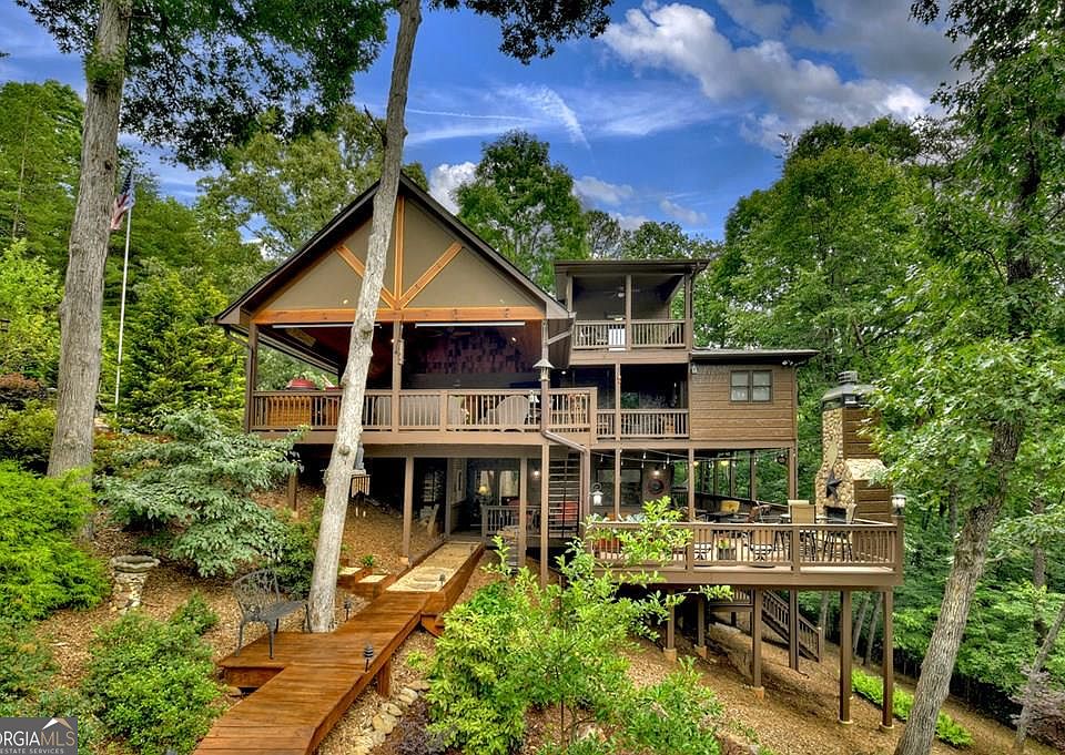 Your Private Mountain Resort Awaits! This extraordinary retreat combines luxury, privacy, and year-round recreation on 2.56 acres with its own pond and long-range mountain views. Outdoor living takes center stage with a heated saltwater pool, sunken hot tub, multiple covered areas with a wood-burning fireplace, fire pits, a grilling station, and sun shades-perfect for both entertaining and relaxation. Inside, the open layout highlights a soaring stone fireplace in the great room, along with a chef's kitchen featuring granite countertops, custom cabinetry, and stainless appliances. Each of the four spacious bedrooms includes a private ensuite bath with custom tile showers. The main-level primary suite offers dual walk-in closets, while the upstairs guest suite features its own balcony and the loft provides an ideal workstation. The terrace level adds a second great room with a gas fireplace, game area, and ensuite guest room, while the lower level offers a very spacious suite with private outdoor living space. Additional amenities include a main-level half bath, a three-car garage with workshop, 4-wheeler bay, half bath, and oversized storage room, plus a heated and cooled flex space above the garage. A dual-fuel furnace, Rinnai tankless water heater, whole-house generator, and mature landscaping enhance the comfort and convenience of this one-of-a-kind property. Whether you're seeking a private mountain getaway or a property with outstanding rental potential, this home delivers resort-style living every day.