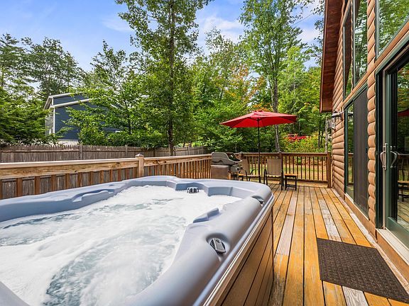 Welcome to 263 Covered Bridge Lane in Bartlett – a classic log-sided chalet set on 1.2 wooded acres. This 3-bedroom, 2-bath home offers a bright open layout highlighted by vaulted pine ceilings, wood floors, and a wall of windows that fills the space with natural light. The kitchen features granite counters and a large island, flowing into the dining and living areas, perfect for gatherings after a day in the mountains. The spacious second-floor primary suite provides privacy, while two additional bedrooms and a full bath on the main level offer room for family and guests. Step outside to relax in the hot tub or enjoy summer nights on the deck surrounded by nature. A new Viessmann boiler (2021) ensures efficient year-round comfort. Store your toys in the 12x16 shed. Owners here also enjoy deeded access to a sandy beach on the Saco River. Centrally located—just 5 minutes to Attitash, 10 minutes to Story Land, and 15 minutes to North Conway’s shops and restaurants—this home is the perfect four-season getaway or investment property (no rental restrictions)