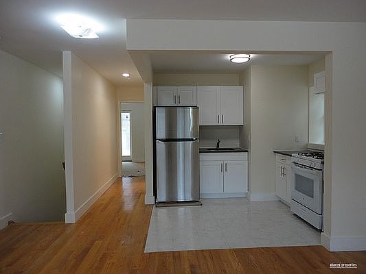 This large renovated one bedroom apartment with a huge bonus room in Kensington has a thoughtful layout and design. The living room is large and bright, framed with four windows. The windowed kitchen has a stainless steel refrigerator and white cabinetry. Down the hall is a renovated and windowed full bathroom with white and gray tiles. The bedroom has a sizable closet and double windows with a glass door leading to the back of the building. Down the staircase in the living room you will find a large multipurpose room that can be used as a home office or gym. There is a cream colored half bath with white and gray tiles in the bonus room. In addition, there is a washer and dryer hookup. Tenant must provide their own washer and dryer. Hot water included. Heat, Gas and Electricity must be paid by the tenant. Great space for the price! Convenient access to public transportation including the F, G, and Q trains, and many bus and express bus options. Also located near the many shops and restaurants on Church Ave and Cortelyou Road.