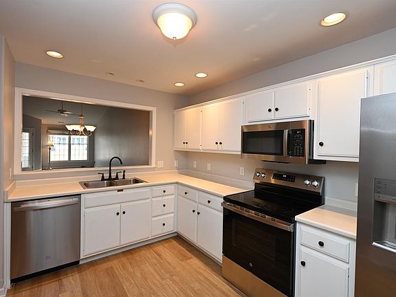 This beautifully maintained one story home features two bedrooms and two bathrooms, showcasing an open-concept living room and kitchen. It includes new carpet, a fresh coat of paint, and brand-new kitchen appliances. Additional highlights comprise a finished two-car attached garage, a storage/workshop shed, eaty to maintain landscaping, and an enclosed sun porch accessible from both the living room and primary bedroom. The primary bedroom suite offers his and her closets along with a spacious bathroom featuring a walk-in shower. The large living room is enhanced by a gas fireplace and a sizable picture window that invites natural light. The stone and vinyl exterior gives this home curb appeal and ensures minimal upkeep.