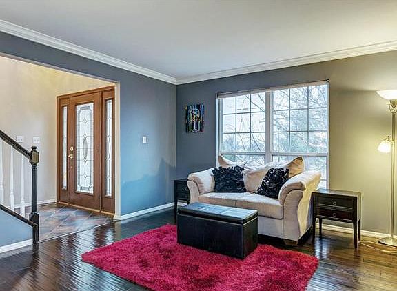 This 2 story home has a beautiful full brick front, 2 car garage, fenced back yard and nice sized patio. Inside you'll find a 2 story entry foyer with ceramic tile, hallway with Bamboo hardwood flooring, a HUGE living room, formal dining room with 3/4" hickory hardwood, eat-in kitchen with stainless appliances, separate family room with gas fireplace and Bamboo hardwood flooring, surround sound and a large bay window, and crown molding throughout. Upstairs you'll find a master suite & three more nicely sized bedrooms - all with ceiling fans. The basement has plenty of storage and a full rough in bath just waiting for your vision.