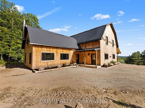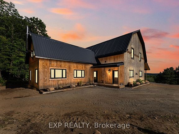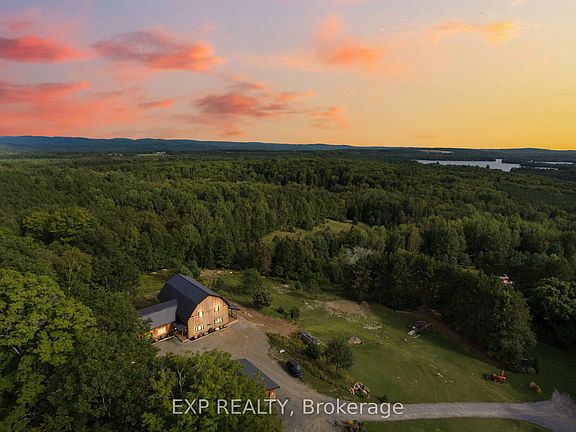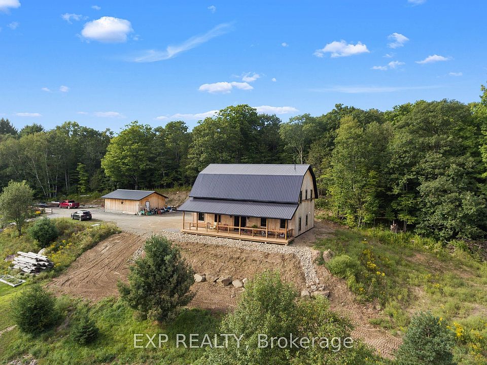 Welcome to this breathtaking custom-designed barndominium, perfectly set on over 23 acres of pristine countryside in the heart of Hastings-Carlow Mayo Township. Newly built in 2024, this remarkable home offers unobstructed panoramic views and a rare blend of modern comfort with timeless rural charm. Inside, soaring 20+ foot ceilings create an open, light-filled atmosphere, complemented by a thoughtful mix of new and reclaimed materials that add warmth and character throughout. The home features 3 spacious bedrooms, 2.5 beautifully finished bathrooms, energy-efficient ICF construction, and a durable slab-on-grade foundation-designed for both style and long-term efficiency. A detached garage provides generous space for vehicles and recreational toys, and the barns provide additional storage options. Outdoors, a picturesque creek winds through the property, attracting abundant wildlife and offering a peaceful, ever-changing natural backdrop. Located in the welcoming community of Hastings-Carlow Mayo Township, this property offers more than just a home - it offers a lifestyle. Known for its strong sense of community, outdoor adventures, and proximity to trails, lakes, and local events, the area is ideal for those seeking connection, recreation, and a slower pace of life without sacrificing modern conveniences. If you're searching for privacy, tranquility, and a true connection to nature within a vibrant rural community, this exceptional property is one you won't want to miss.