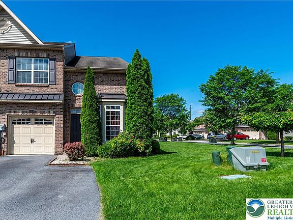 Welcome to this beautiful 3-bedroom, 2.5-bath end-unit townhome that offers comfort, space, and modern convenience. Step inside to a stunning two-story central hall foyer that flows into a formal living room featuring wall-to-wall carpet, a vaulted ceiling with a ceiling fan, and a charming bump-out window that fills the space with natural light. The open-concept layout continues into the dining room with durable tile floors, perfect for entertaining. The eat-in kitchen boasts tile flooring, recessed lighting, and a stainless steel corner sink, blending function and style. Adjacent to the kitchen, the cozy family room offers wall-to-wall carpet and a vaulted ceiling, creating a welcoming retreat. A convenient powder room with a pedestal sink completes the main level. Upstairs, all bedrooms are fully carpeted, including the spacious master suite with a walk-in closet and a luxurious en-suite bath featuring dual sinks and a tiled walk-in shower with a sleek glass sliding door. The additional full bathroom offers a tub/shower combo for added convenience. Outside, the home showcases a brick and vinyl facade, a one-car garage, and a paved driveway. Conveniently located close to highways I-476 and I-78 for easy commute, Lehigh County Sports Fields, Golf Course, Dorney Park, shops, restaurants and so much more! This well-maintained townhome is a perfect blend of comfort and elegance ready for you to call it home.
