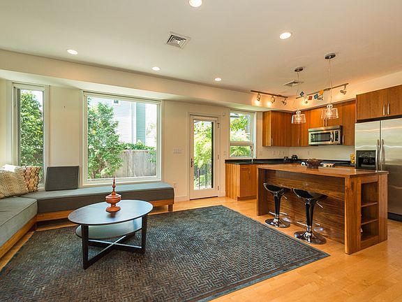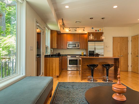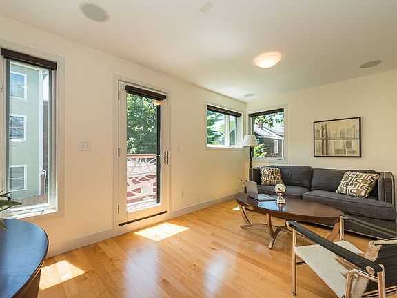 Contemporary townhouse built in 2008 with southern exposures and access to the outdoors from all living levels. Enter the front door into the open layout, light-filled first floor. Sleek built-in sectional anchors the living room with a custom walnut dining island defining the kitchen. The kitchen is designed with wood cabinets, granite counters, stainless appliances - new in 2008. Convenient half-bath on the first floor. The kitchen overlooks and accesses the private fenced-in back yard with geometric bluestone patio for al fresco dining. On the second floor there is a bedroom with large closet and built-in shelving, full bathroom, and large office with surround sound installed (could easily be converted to a third bedroom), and a sunny deck. The master suite comprises the entire top floor with custom-built walk-in closet, full tiled bath, and a large deck with verdant tree line views. The lower level includes a family room with direct access to the backyard.