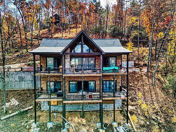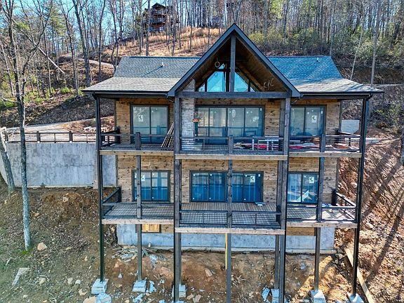 Breathtaking Layered Long Range Mountain Views located within minutes from Downtown BLUE RIDGE. This house is a rare find, perched atop Blue Ridge surrounded by stunning scenery. It's perfect for those looking to buy an investment property or alpine retreat alike; with its gorgeous hardwood flooring and spacious living spaces, you'd be hard-pressed to find a better long range mountain view anywhere else! The first impression you get is that top of the world livin' feeling with oversize sweeping doors and windows overlooking those gorgeous mountain views on display from every room. With 4br/3ba + a half both on both levels this open and inviting floor plan includes an opulent interior which is light and uplifting and incorporates large entertainment spaces, generous en-suite spaces and a Primary Suite on every level. The main level primary bath has that spa-like feeling includes heated flooring, gorgeous large tile shower with a stand along soaking tub to create that oasis of peace and relaxation. Throughout the home features gorgeous natural hardwood flooring, granite countertops, high-end appliances, luxury finishes with wood accents all perfectly combined to give off a nice touch of that Appalachian Rustic flare paired with the right touch of Modern. Custom design includes walk-in closets, cabinetry, wet room style bathroom, double vanity sinks, and wood accents throughout, wet bar, two car garage, & a stone wall makes this the perfect North Ga home. Call for a video tour!