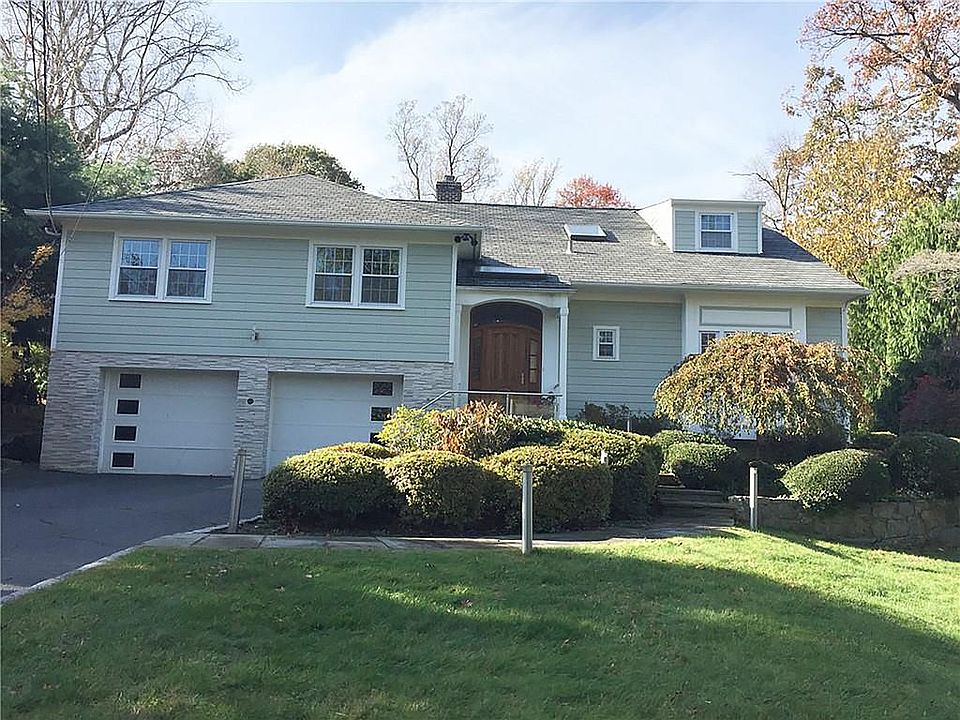 MODERN FEEL AND AVAILABLE IMMEDIATELY. Easy living in this raised ranch home with 4 stairs up to the bedroom level. Completed Hi-end Master bath reno & new closet doors in Mstr bedrm & bath. Fab. location-walking distance to Edgemont middle & high school & the Hartsdale train. The skylights & large windows in this contemporary home fill the space with sun & the large rear stone patio with modern "glass" railing is a great mix of traditional & contemporary. Expansive yard overlooking Greenburgh Nature Prk. Open concept eat-in kitchen/family rm w/stone countertops & white cabinetry- leads into oversized living & dining rm combo w/large glass doors overlooking the expansive yard. An office/den w/built-in bookcases & powder rm & 2 hall bedrms round out the 1.5 floors. The 2nd level-great for guests, has a full bath, large rm & add'l adjacent finished space/add'l storage. The lower level has 550 SF of space/storage, sep. laundry & a 2-car gar. BFR.com 4 shrt term furniture rentals.