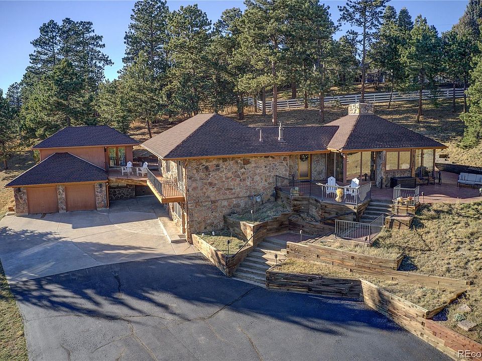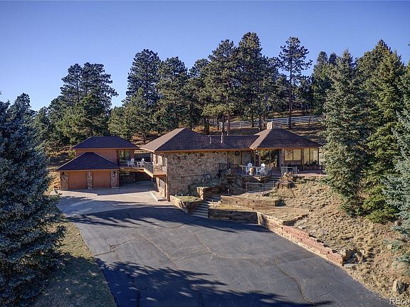 Nestled in the foothills of Lookout Mountain in Genesee, this Paradise Hills home is a rare gem! This home is known as the prestigious "waterfall house". Enjoy wildlife, stunning views and a beautiful waterfall feature on this one of a kind lot. This property includes the main house with 3 beds and 3 baths, and the studio guesthouse right just off the deck. The main level has floor to ceiling windows with a walk around rock fireplace in the great room. The kitchen boasts with natural light and includes beautiful updates such as stainless steel appliances and quartz countertops. Complete with wood flooring throughout the main level and new carpets recently installed in main level bedrooms and office area. Stunning main floor master suite with custom built closets and a beautifully remodeled master bathroom. Across the patio is the guest house with its own kitchen, bathroom, and private deck which makes it perfect for guests or an additional office setting. Spend evenings on the wraparound patio that includes a beautiful one of a kind water fall feature in the back. Front patio is south facing and offers mountain views. Heated 2 car garage offers plenty of space for parking and a workspace area. Ample parking provided in the large paved driveway. Location is key is this incredible home as it is only 2 minutes away from I70, 45 minutes to ski slopes, and hiking and biking are right around the corner. Wildlife lovers take note, as deer and elk often frequent this property.