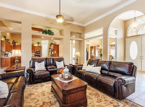 This highly desired Lennar Pinnacle home is a must see! It has gorgeous curb appeal, sits on an angle with a huge lot! The inside has plenty to boast about starting with a fabulous open floor plan, designer paint, beautiful travertine flooring, plush carpet in bedrooms, study, and office, high ceilings throughout, custom pull down shades, crown molding in the great room, beautiful light features throughout, built-in floor to ceiling library book shelves in the study, and an amazing office or entertainment room with gorgeous double french doors. The family room has cozy fireplace beautiful view of the backyard. Kitchen features a large granite tiled island, stainless steel appliances and 5 burner gas stove. Bedrooms are large and the master suite has a large walk in closet, large windows, access to the backyard, a large jacuzzi tub and walk in shower. Backyard is huge with potential RV parking on the side, covered patio, beach access pool with waterfall. Water softener is paid for.