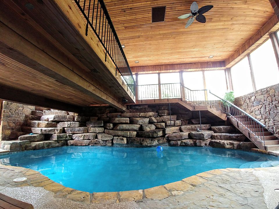 One of a kind entertainers home near Southern Hills golf course Indoor gunite pool with waterfall and large 2nd story deck, 3 bedrooms + game room + craft room (or 4th bedroom), 3 full baths, 2 half baths, 2 living, 2 dining, granite kitchen, wood burning fireplace. Very unique property located in hilly cul-de-sac and lots of privacy. Hot tub and gazebo. Owner/Agent