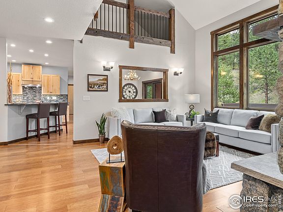 Escape to your Estes Home! This stunning custom mountain home is a true haven, with impeccable design and breathtaking views. Step out into the backyard Private Sanctuary with huge deck, garden beds, hot tub, fire-pit & play space. You'll be captivated by the panoramic mountainscape with nature's beauty as your constant companion. The home is beautifully orchestrated and of the highest quality throughout, featuring soaring ceilings, floor to ceiling rock fireplace and wood floors! The kitchen, with high-end stainless steel appliances, gas stove, granite countertops and big pantry, will delight any foodie. Stretch out in the spacious upstairs rec room w/ 3/4 bath which could be the home theater, yoga retreat, music space, the possibilities are endless. Main floor primary bedroom features a spa-like bath and large walk-in closet. Fish Creek Biking/walking path goes right by the home & just up the road is Little Valley access to Nat'l Forest. Downtown Estes is 5 minutes and Rocky Mountain National Park is 10 min. Don't miss out on the chance to make this mountain retreat your own private escape.