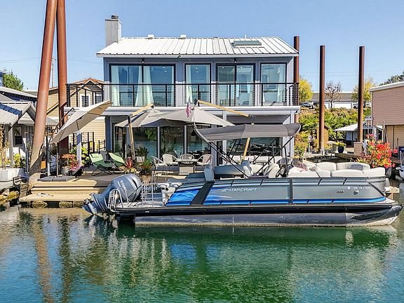 Soaring entryway welcomes you into this elegant, fully remodeled contemporary floating home with ownership of a south-facing slip. The floating house has a float that rated a 4 in May of 2023. Open concept floor plan. Entertainer’s kitchen features newer stainless appliances, beverage cooler, and large waterfall island with seating for 6+. A wall of windows brings plenty of natural light and serene Columbia River view. Living area opens onto an expansive cedar deck, partially covered for extended outdoor enjoyment + two gas hookups. Laundry room lined with cabinetry for generous storage (washer/dryer included). Engineered wood flooring. Mini split AC and heat in all spaces. Two gas fireplaces. Airy upper level family room and light filled primary suite both open onto wrap-around deck. Spacious ensuite bathroom with dual sink vanity and generous storage. Each bathroom has beautiful tile work and quartz. Don’t miss the oversized 2-car garage with storage in the attic. This floating home is in a fantastic, gated moorage that includes slip ownership. Pet friendly!