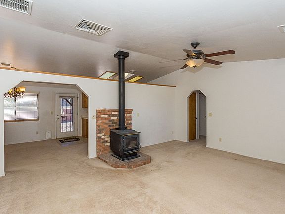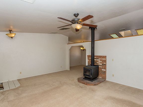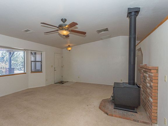 When walking through the front door, a spacious living room with vaulted ceilings welcomes you as the large windows let in an abundance of natural light. A wood burning stove with brick surround is the focal point. The eat in kitchen has room for a dining table and bar seating, great for entertaining family and friends. The master suite has double sinks with plenty of space to get ready. Two other bedrooms and bath allow space for family or extra bedrooms for guests or hobbies. A covered patio just outside the kitchen makes for a peaceful spot to sit, relax and enjoy the seasons of Northern Arizona. A two car garage and bonus carport big enough for an RV gives plenty of space for toys. A couple of extras include a 16 x16 shed and dog run. This home is located on a level acre lot with