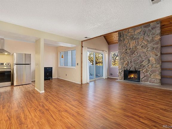 Fantastic 1-bedroom, 1-bathroom condominium nestled in the highly coveted Strawberry at Heatherridge community. This unit boasts an inviting open floor plan highlighted by a living room adorned with vaulted ceilings, a cozy wood-burning fireplace, custom built-ins, and sliding glass doors leading to a deck. Enjoy meals in the dining area illuminated by a sunny window. The kitchen is equipped with stainless steel appliances, and there's a convenient laundry closet with a full-size washer and dryer. Laminate flooring adds durability to the main floor. Upstairs, discover a spacious loft-style bedroom with a private bath and access to a second deck. The property comes with all the necessary appliances, including a newer refrigerator and countertop microwave. Parking is a breeze with one detached carport and ample additional spaces. Community amenities include a clubhouse, pool, and a picturesque water lily pond attracting an array of birds and ducks. Conveniently located with easy access to RTD and I-225, plus plenty of nearby shopping and entertainment options. FHA approval makes this complex even more appealing!