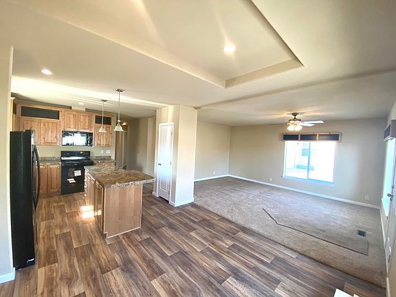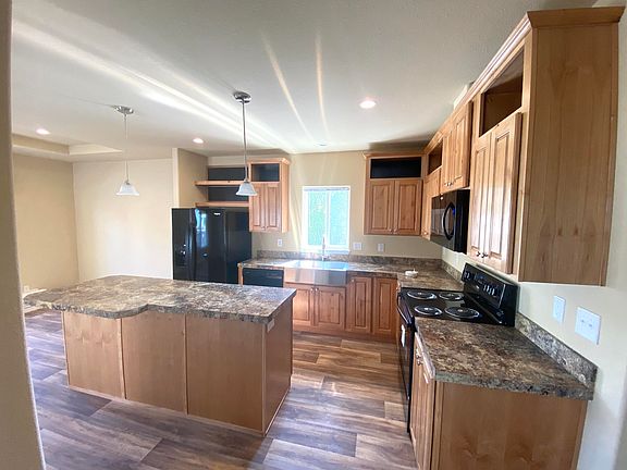 New 2019 Fleetwood home with an attached double car garage, covered front porch and it backs to the seasonal water feature creek. All the black appliances are included with a side by side fridge. The kitchen has a center island, pantry and farmhouse apron stainless steel sink. Blinds are already installed throughout.