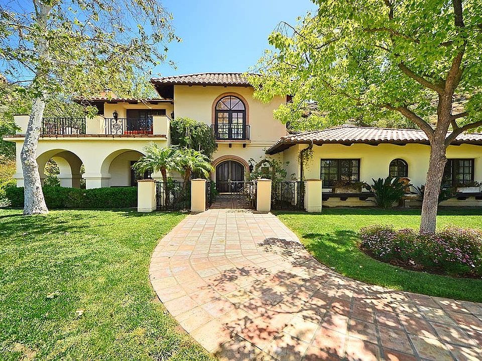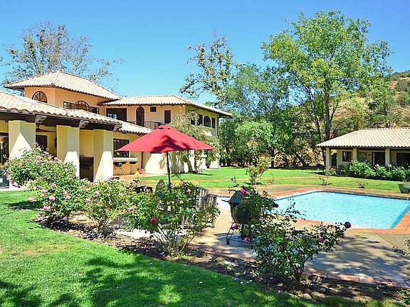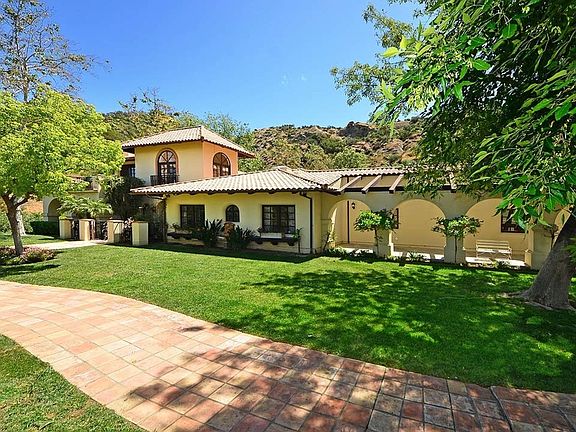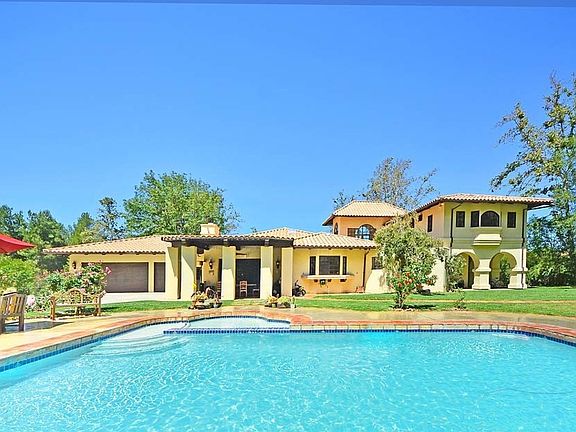 Villa Santa Maria is a stunning classic California Spanish estate set on 10+ gated acres of total privacy. The elegant main house features 3 bedrooms and 3 baths, office, gourmet kitchen, living room with fireplace, a great room with open beamed vaulted ceilings and fireplace, and a dining room opening to a sunny two story central courtyard. The master retreat enjoys beautiful views from the balcony, a jetted tub, and dual walk-in closets. The estate was designed to enjoy an outdoor lifestyle with the covered outdoor dining area, a sparkling pool and spa, and huge grassy lawns all surrounded by distant canyon views, massive rock formations and towering mature trees. There is also a large detached 1 bedroom 1 bathroom guest house and oversized 3 car garage. A wooded trail connects the 2 stall barn to a 60 x 140 ft. sand riding arena. Located on a private road with nearby access to State Park hiking and horse riding trails and centrally located between beaches and major shopping centers.