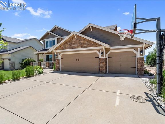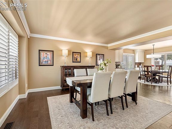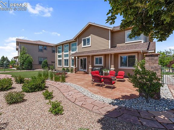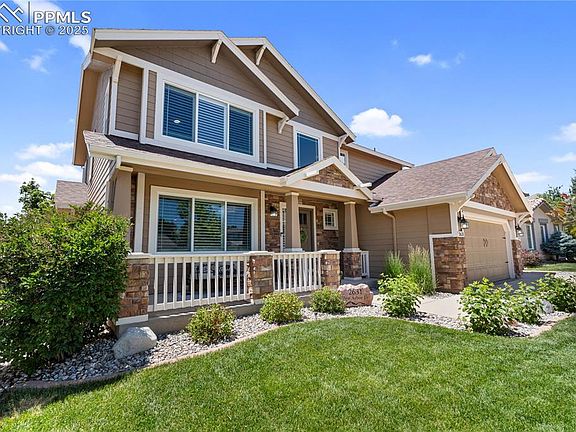 Iconic Views | Golf Course Living | Close to Everything. Delight in breathtaking views of Pikes Peak, the Front Range, Garden of the Gods and Air Force Academy. Home has so much to offer - nothing lacking. Impeccably kept from floor to ceiling with a lot of attention to detail. Cul-de-sac location, beauty, comfort and upgrades. The gourmet kitchen features an expansive 13x5 granite island with space saving pop-up outlets, canopy range hood, slide ranch cooktop, full-size freezer and refrigerator, and slide in range. Kitchen features upper end Jenn-Air appliances, 42' cabinets, soft-close drawers and pull-out cabinet shelves and beautiful pendant lighting. Accents and custom built-ins throughout add nice touches - Simply a perfect place to call home. Take it all in deep rich engineered flooring great condition, updated Taj Mahal Quartzite countertops in bathrooms, Southern shutters (insulation, aesthetics), custom wainscoting, updated light fixtures and ceiling fans, LED lighting, new energy-efficient windows (lifetime transferable warranty to include screen replacement), skylight w/ remote blind and Bluetooth fan, new interior doors throughout. Basement, finished (2014), features a secondary family room with 2 dedicated spacious bedrooms, full bathroom, wide hallway, decorative wall lighting and lots of storage. There is the cutest most precious "little" must see space in the basement. Go outside and see that the theme of abundance continues. From the approach, welcoming and spacious front porch for relaxing, landscaping, concrete edging, to a backyard w/ fireplace, large stamped concrete patio, artificial turf, greenery all backing to the 18th tee on the Pine Creek Golf Course - views and more views. Well maintained systems. Whole house humidifier, Lenox A/C (2024) and Lenox heating (2024) - both equipped with Wi-Fi app for monitoring. Easy access to parks, trails, shopping, local schools. This home is truly poised to impress, a very beautiful space.