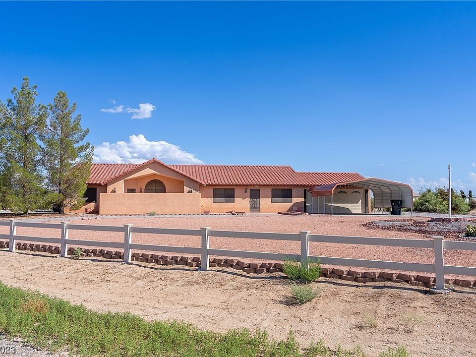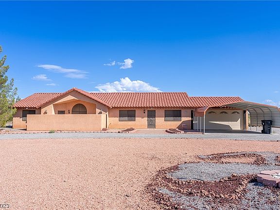 Beautiful Single-Story home with great curb appeal. Fully fenced 3-bedroom 2 bath home located in the rural quiet area of Pahrump. This home is on over an acre of land with mature desert landscaping and no water bill . The property is grandfathered in with 2 acres of water rights, 2 car garage and a 2-car, car port as well as a NEMA 14-50 220 charger . Open floorplan with tile flooring throughout for easy maintenance. Shutters in living room, family room and kitchen. All bedrooms and family room have ceiling fans and lights. Fully enclosed sunroom and front courtyard. Convenient access to all that Pahrump offers. **This home is a must see. Seller will include .46 acre attached vacant lot (APN 40-301-03) with full price offer.