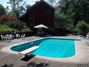 Sharp home on over 3 acres in the heart of Niskayuna, Lisha Kill Preserve across the street, walking distance to Iroquois MS and Rosendale Elementary. Beautiful landscaping with extensive block walls, patio and fire pit. In ground pool with huge deck area, great for summer parties! This efficient passive solar designed home features cathedral ceilings with sky lights, exposed beams and duct work. Home was built with finished lower level including garden windows and walk out door to patio area. 1 of a kind!