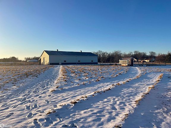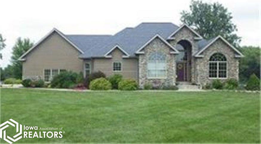 Quality custom built home offering almost 4,000 finished square feet. This Ranch home sits on 11.26 m/l acres on a hard surface road. Main floor offers kitchen with appliances, granite countertops and eat in area. Open concept to living room with gas fireplace and french doors to lovely rear deck overlooking the large stocked pond that is rock lined and dining room. Master bedroom with master onsuite including tile shower, double sink vanity and walk in closet. Additional two bedrooms, full bathroom and large mud room with washer and dryer. Lower level provides large family room with pellet stove and wet bar, additional guest suite bedroom with full bathroom on suite, rec room, gaming room, and storage galore! Property has rear house fence and livestock fence around the pasture. Metal 50x90 metal building with additional 18x45 lean to. Building has water and electric and two overhead doors. Home comes with whole house generator perfect for our Iowa winters.