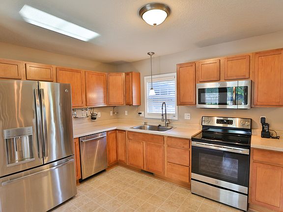The eat-in kitchen has all newer stainless steel appliances and ample storage with a full pantry. There's also a great half bath at the rear entrance of the home perfect for guests and for washing up after working on projects in the large two car garage.