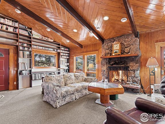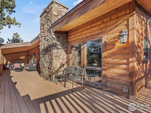 Retreat to this private mountain property situated on 1.32 acres at the end of cul-de-sac, with 4 bedrooms and 3 bathrooms. Added lower level ADU offers 5th bedroom, open living and 3/4 bathroom. Over 3,700 sq ft log exterior home also includes a massive detached outbuilding with a unique corridor from the kitchen to a small elevator down to the added space. So many opportunities there! A conversation starting living room showcased with a custom gas log fireplace with stone and moss rock surround, herringbone patterned wood ceiling and beams, large windows and sliding door to upper deck and floor-to-ceiling bookcases fit for a personal library. An area abundant for entertaining as well as personal enjoyment, the open dining and kitchen include a center island, cathedral ceilings, ample cabinetry and pantry, stainless steel appliances, eat in kitchen as well as the spacious dining space. Cooking in the gourmet kitchen will never be boring. Miele induction range, double oven, farm sink with fantastic view window, onyx countertops with rounded edges, bright lighting and beautiful custom windows. Light-filled main bedroom has a gas log fireplace with gorgeous stone surround, ensuite bathroom complete with fancy bidet, double glass vessel sinks and large glass shower, 2 walk-in closets and sliding door. World class outdoor adventure in Rocky Mountain National Park is only a few miles away. Year round accessibility, 10 minutes south of downtown Estes Park and under an hour to Colorado's Front Range. The added 5,506 sq ft workshop/garage was built by a model train enthusiast but could be converted for use as a workshop, creative studio, home fitness center or exercise studio, home office, fun hangout space, micro-farming barn, recreational equipment storage or other general storage, or all of the above! You are going to LOVE living here.