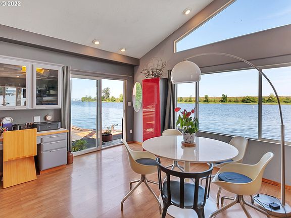 Drive through this small bohemian moorage to a very private floating home with spectacular views. Light filled great room has big windows and cozy wood stove. Large artist studio or workshop with storage loft. Space to park a large boat plus a deck to launch a kayak or paddle board. South facing deck with open water view and abundant fish and wildlife. Zonal heating and AC units for comfort in all seasons. Financing available. Future float repair needed. Sold as is.