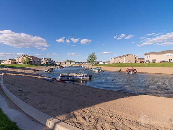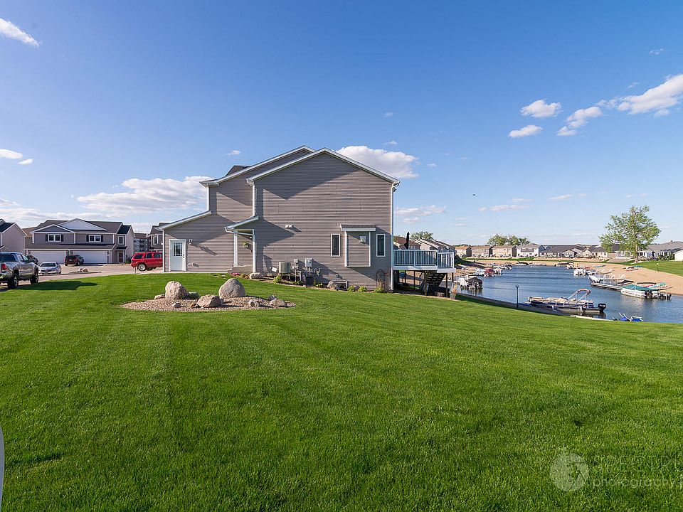 WATERFRONT Twin Home. 3 Bed, 4 Bathroom, Finished Basement, Oversized Deck, and No Specials! Imagine waking up every day to breathtaking views. This exquisite twin home was the builder's MODEL HOME, and no detail was left undone. The main level has a gas fireplace located in the living room with beautifully updated surround and rustic mantel. Entering the kitchen, you will find an upgraded gas range, under-mount sink, quartz countertops, and stainless appliances! The main level, master bath, basement, and the deck have surround sound! Upstairs there are 3 large bedrooms and 2 full bathrooms. The master is oversized and looks out to the water. The master bath has dual sinks and quartz countertops. This home also has a hard to find basement that is completely finished with a family room, bar, and bath. The attached 2 stall garage has hot/cold water, floor drain, workbench, heated, insulated, textured, painted, insulated garage doors, and both walk-through doors are upgraded to include a window for extra light and curb appeal. This twin home is on a corner for you to enjoy plenty of grass for summertime entertaining. Owner is Licensed Real Estate Agent in the State of ND