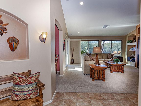 You will love this house! Mountain view and back arroyo with wildlife as your neighbors. Fastidiously maintained 2BR, 2BA +den with features galore! New PVC irrigation system and refreshed landscaping rock in Jan 2020,. Roof underlayment replaced Spring 2019,. Exterior painted Nov 2017. Central vac, FP & built-ins in great room, hickory kitchen cabinets with auto-drawers, granite countertops, S/S appliances (newer Bosch DW), under cabinet lighting, top-of-the line W/D. Garage (22'x20')is a man-cave dream. Better-than-epoxy Polyguramine floor, cabinets with workbench, LED light. Fully walled backyard w/water feature and that view! Front courtyard with mature landscaping. Furniture and golf cart available SBOS.