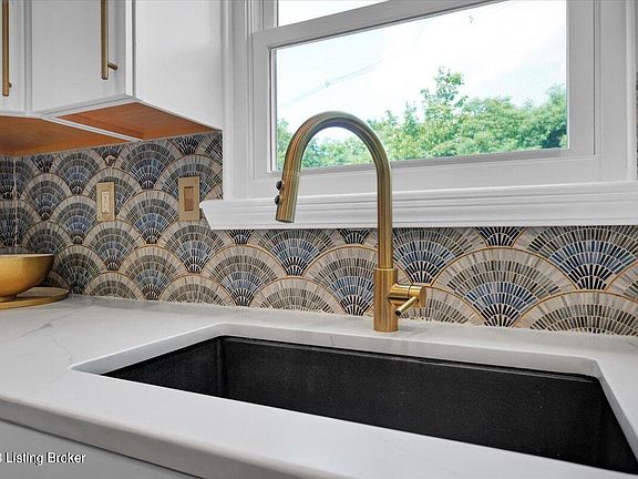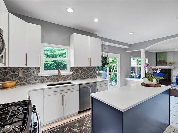 into the home. Step inside, and you'll be immediately impressed by the contemporary hexagonal floor tile and stunning sputnik chandeliers, adding a touch of modern elegance to every room. The first floor of the home has a remodeled half bath, office or reading room, and a dining room. The heart of the home is the eat in kitchen and spacious family room with a FIREPLACE. The kitchen offers a seamless blend of style and functionality adorned with sleek QUARTZ COUNTER-TOPS, blue ombre mosaic tile, and GOLD ACCENTS. Admire the craftsmanship of the CUSTOM CABINETS, which are not only beautiful but also