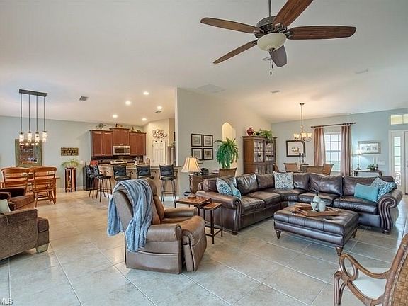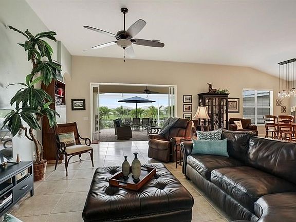 Gracious Lake front home with large picture framed screened lanai. (22x40) Beautifully done with pavers and different seating venues under truss and open seating Both takes full advantage of lake view and swaying palms, Designer upgrades in open concept, volume ceiling, gathering room include, 18" Porcelain tile flooring, beautiful light fixtures, decorator ceiling fans. The well planned kitchen and eating bar has granite counter tops, subway and glass back splash, counter depth refrigerator, 42" upgraded cabinets and stainless appliances. Spacious master bedroom has tray ceiling and big windows for lots of natural light Bathroom has upgraded tile walk in shower and double sink granite top vanity. The guest bedroom and or office is accessible by French doors. Third bedroom has a tray ceiling. The laundry room has a laundry tub and additional storage cabinets. Owner owned water softener is also included. This lovely model like home perfect for entertaining and enjoyment in Sandoval can be the next home for a lucky buyer.