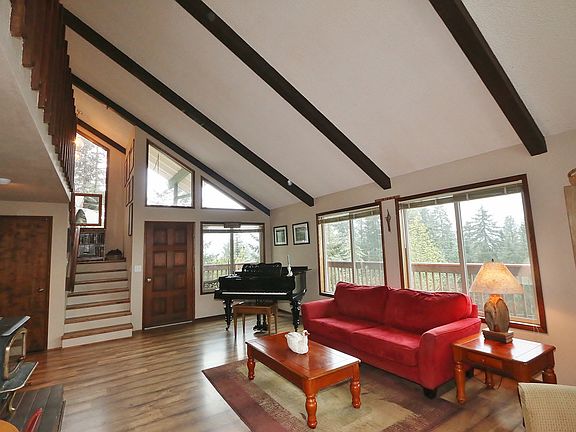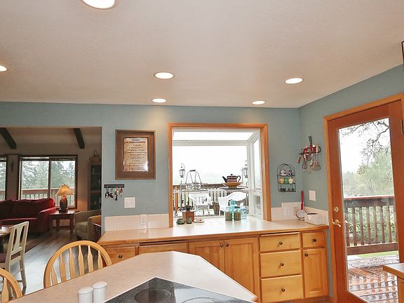 5.03 acre horse property features fenced pastures, a 27x36 Barn, 12X40 RV garage or shop, plus a 24X30 detached garage. Enjoy the beautiful valley views, manicured landscape and fenced garden area from your wrap around deck. House has newer interior paint, laminate flooring, master bedrooms on each level, kitchen island, vinyl windows, heat pump w/air conditioning, and vaulted ceilings. This property has it all!Just 20 min from Eugene