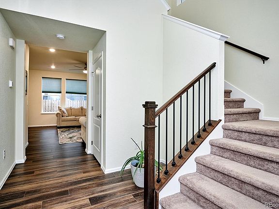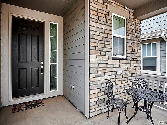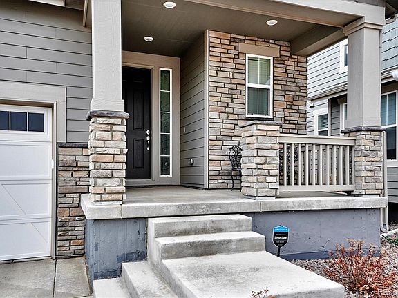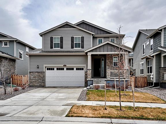 Welcome to this spectacular 2 story home in the highly sought after Adonea neighborhood. As you enter this better than new home, you are greeted with a light, bright and open floor plan. The main floor features luxury vinyl plank floors throughout, a large great room, dining area and upscale kitchen. Along with a large island, the kitchen also boasts granite countertops, glass tile backsplash, gas range, stainless steel appliances, walk-in pantry and 42 cabinets. A half bath with pedestal sink and mudroom with built-in bench seating completes the main floor living area. As you head upstairs, the large window on the staircase landing provides additional natural light. The second floor has three bedrooms, two baths and convenient upstairs laundry room. The spacious primary bedroom offers an elegant coffered ceiling. The primary ensuite bathroom has two sinks, ample granite counter space, walk-in shower and huge walk-in closet. The two additional bedrooms share a full bath with dual sinks. Don't miss the oversized two car garage and fully fenced backyard. An entertainer's dream for enjoying the beautiful Colorado weather, the back deck is fully covered, has composite flooring, stone exterior wall and wide stairs leading to the backyard. The backyard has tons of turf to enjoy time with friends and family. This beautiful home has smart lights that can be paired with Alexa to control the lights and also has solar to reduce your energy bills. The full unfinished basement has tremendous potential for additional bedrooms, bathroom and family room. This Lennar home is in a great community featuring convenient amenities such as community pool, clubhouse, parks, trails and more! Easy access to E-470 and I-70 and just a short drive to DIA.
