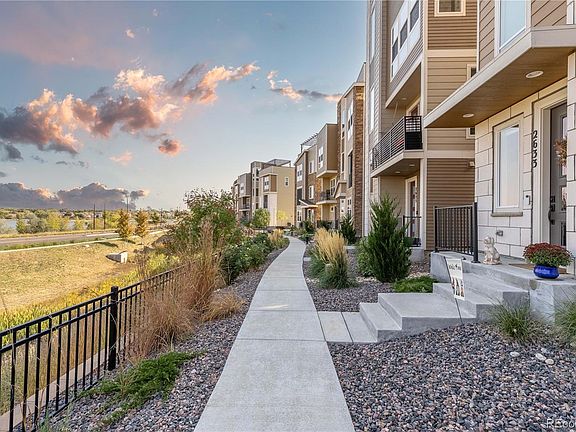 This better-than-new cityscape-style home in the lively Hunting Hill neighborhood offers both style and community. Nestled in a social, pet-friendly area, this home features a priceless view from the large rooftop Trek deck overlooking the lake and mountains. It is meticulously maintained, and its charm is apparent from the moment you step onto the welcoming front porch. Inside, gorgeous hardwood floors flow throughout the main living areas. The main level includes a versatile office space that could easily serve as a third bedroom. The second level boasts a grand open layout with a spacious living room and an expansive eat-in kitchen. The chef-worthy kitchen features espresso wood cabinetry, a 5-burner gas cooktop, quartz countertops, and a large center island perfect for gatherings. Step out from the living room onto a private balcony with lake views & a motorized shade. No neighbors are in front, offering added privacy, along with a convenient storage closet. On the third level, you'll find two generously sized bedrooms, each with walk-in closets. The primary bedroom features a spa-inspired en-suite bath and stunning views of the mountains and lake. Continue up to the fourth level, where a landing leads to the expansive rooftop deck with the most breathtaking lake and mountain views, ideal for entertaining or relaxing while watching the beautiful sunsets. The composite Trek deck features water, a gas valve and a misting system on the pergola for warm summer days. Convenient 2- car attached garage. Quick access to C-470 and Santa Fe Dr to easily get you anywhere you need in minutes. This move-in-ready gem offers luxurious living with views that will leave you speechless.
