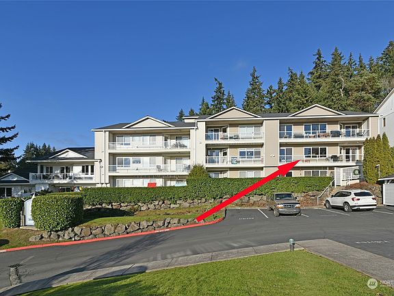 Enjoy the tranquility of this sunny second floor unit. this unit has views of a forested ravine and a deck facing South with views of the Olympics. 3Br/2Bath with spacious living room, beautiful propane fireplace, and master suite & balcony. Enjoy your morning coffee or afternoon tea on the main balcony overlooking the beautiful Olympic Mountains or take in the array of colorful sunsets while enjoying an evening mocktail. This unit comes with a 1 car garage & carport parking. Harbor Place is minutes from the ferry, marina, & downtown Kingston. .