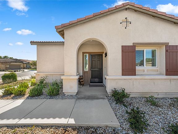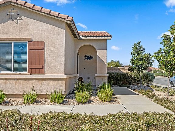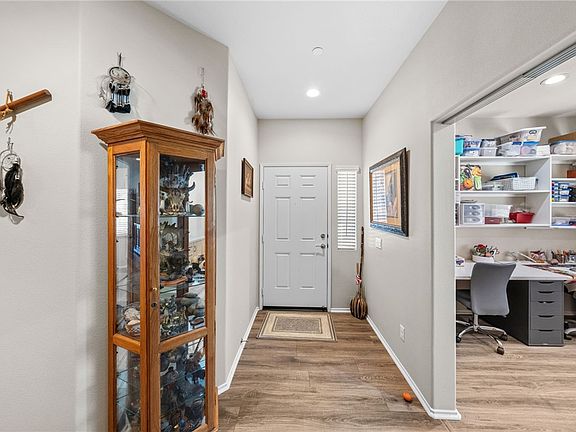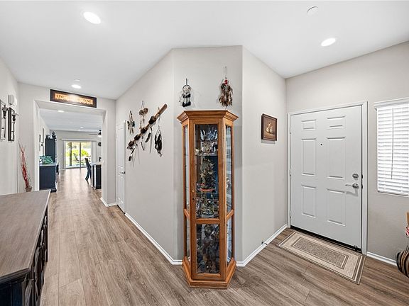 *TURN KEY* You're invited to tour this wonderful 2-bedroom, 2 bathrooms with front office or 3rd bedroom home right here in the sought after community called 'The Holiday' a premier senior living gated community. This thoroughly maintained home was built in 2018 and comes fully landscaped front and back with professional grade concrete installed on either side. This home is located near the community amenities yet comes as a CORNER lot in this quiet and serene location. As you enter the home you will notice recessed lighting throughout with upgraded wood laminate flooring, with our first stop into the office located at the front of the home with street view access. Additionally, this room can be converted into a bedroom at new owners' option and convenience. As we walk the well-lit hallway you are greeted with an open kitchen, dining and living room space. The stone counter tops are easily noticeable along with stainless steel appliances throughout the space. The space is open with upgraded drop lighting over the dining table for well-lit meals in the evening and many windows to fill the space with natural sunlight during the day. Both bedrooms are located to the side area of the home with the full spare room and hallway access to spare bathroom and garage entry. Moving from the comfy and spacious living room, down the short hallway and into the main suite of the home. Upgraded ceiling fan, and well-lit his and hers bathroom accommodations. You will notice the light coming in from a window set, positioned with a prime view of the well maintained and fully landscaped backyard. Entering under the paint matched, aluminum patio cover you will quickly notice a color matched above ground spa/jacuzzi with fully working insulated cover. If that is not enough, walking through the yard and amongst the beautiful plants, flowers and low maintenance turf lawn, you are greeted with a favorite space among the current owners. On especially cool and relaxing nights you may elevate the ambiance by sitting fire side of the above ground fire pit conveniently located on the spacious rear patio. This home has a solar system installed with low electricity costs year-round. This home boasts a 2-car garage with automatic garage door and side entry.