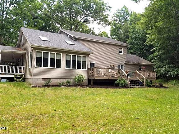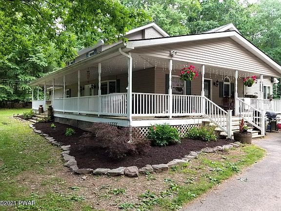 This 4 bedroom, 3 bath Farmhouse style on 1 acre is located at the end of a private road. Master on the main floor with beautifully tiled master bath and huge walk-in closet. 3 bedrooms and bath on the second floor. Granite countertops and tile floors in the kitchen. The skylights in the dining room along with the large windows offer plenty of natural light. The home office includes built-in cabinetry. The Den makes a perfect game room. The spacious Living Room includes cathedral ceiling, a full wall of built-in cabinets, hardwood floors and French Doors lead to a large deck (16 x 28) for entertaining. The covered wrap-around front porch makes this a great property for a family or large weekend gatherings. Paved driveway. No neighbors to the rear, property backs to 500 + Private Acres.
