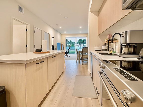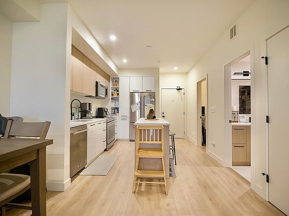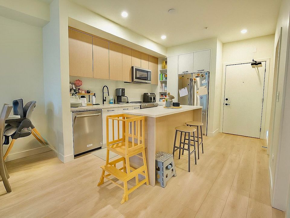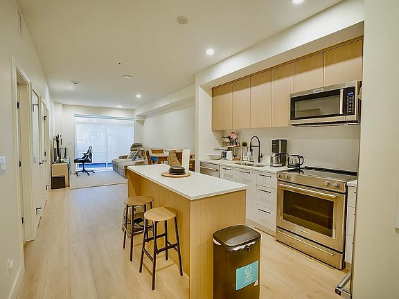 Open-concept layoutFull-sized stainless steel appliancesElegant white quartz countertopsWhite tile backsplashWide-plank wood-grain laminate flooring