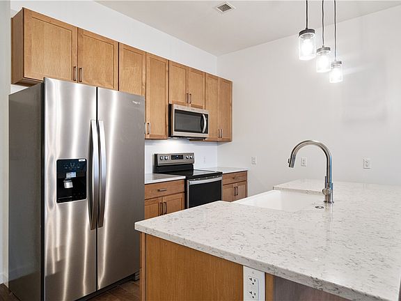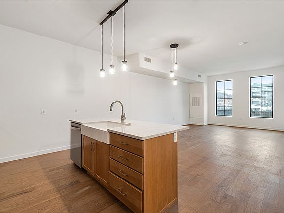BRAND NEW and now complete and move-in ready! This well-designed 1 bed/ 1 bath condo with large windows has 883 SF of interior living space with an 89 SF private balcony. Modern kitchen includes quartz countertops, deep farm sink, pendant lighting, and island with extra storage and room for bar stool seating. Hardwood floors throughout. Bedroom also features large windows and a walk-in closet. Bathroom includes tiled, walk-in shower and quartz countertops. In-unit laundry hookups. Includes deeded, integral garage parking! Building features stylish lobby, garage parking, two elevators, common courtyard for entertaining/grilling, and a fitness center on level 2. Live in the heart of the vibrant Strip District just steps away from the some of the best biking and walking river trails, bars, restaurants, and shopping the city has to offer. Three-year tax abatement!