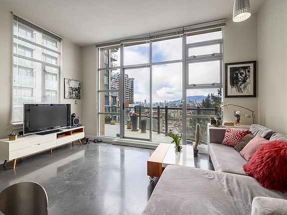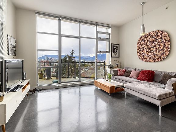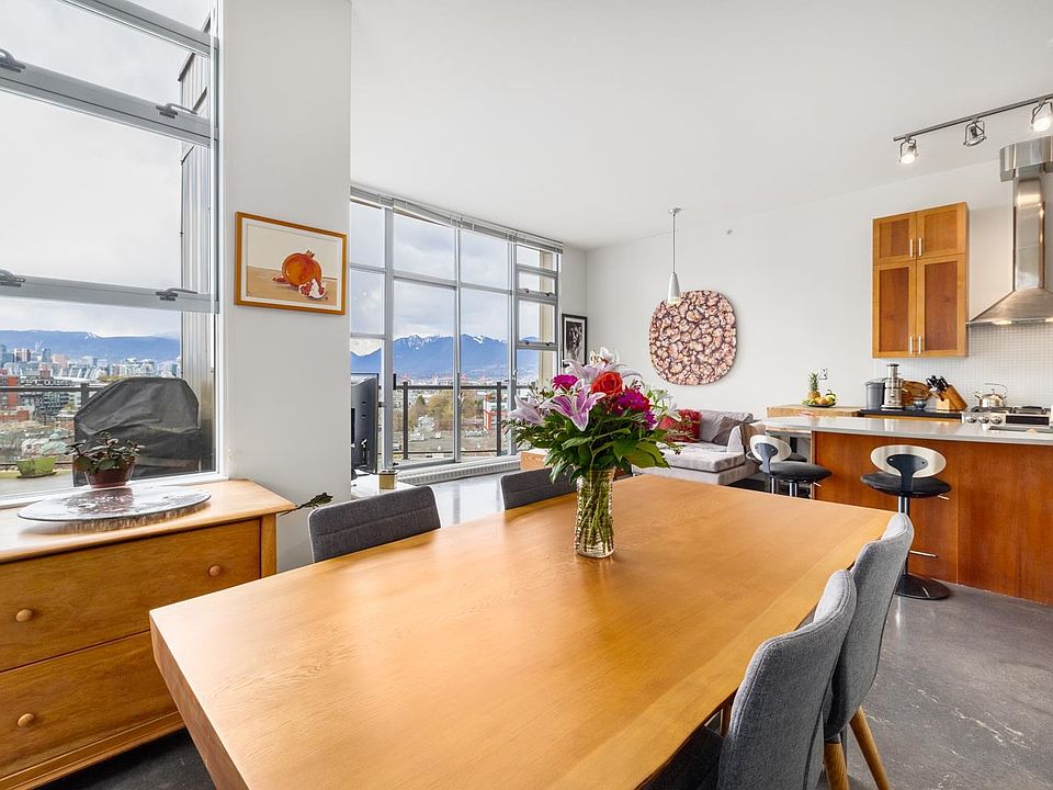 Welcome to the top floor of SOMA Lofts in the heart of Mount Pleasant! Penthouse 606 offers 10.3 Ft ceilings throughout & 1,022 SqFt conveniently delegated on one single level. For the entertainer in you, the open concept living/dining/kitchen area opens seamlessly out onto your corner wrap around 231 SqFt Patio with completely unobstructed views of Downtown Vancouver & the North Shore Mountains! Polished concrete floors & exposed concrete feature walls throughout gives you another element of true loft living amongst the endless amenities of Mount Pleasant in East Vancouver. Common Gym & 5th floor patio are at your disposal here. Unit offers a new kitchen island countertop & pain throughout. 2 Parking + locker also at your convenience. In-suite Storage easily big enough for office!