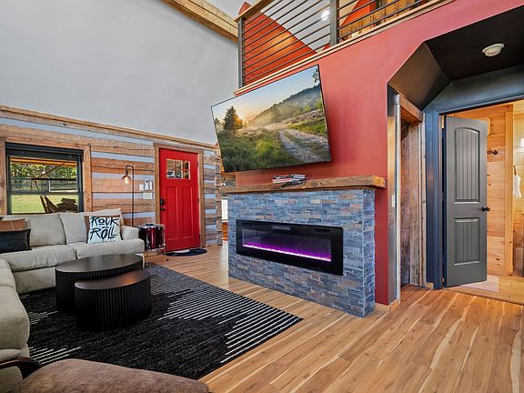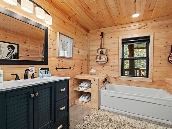 Welcome to The Rock House, the ultimate vacation rental home where the spirit of Rock-n-Roll is alive and well, nestled in the breathtaking Red River Gorge area of Kentucky. This newly renovated cabin is a haven for music lovers and adventurers alike, offering an immersive experience that combines luxury, comfort, and a touch of rebellion. As you step inside, you'll be greeted by an interior that hits all the right notes, tastefully decorated to ensure every moment of your stay is in perfect harmony with the theme. The Rock House comfortably sleeps up to eight people across four themed bedrooms, each a tribute to the legend of rock music. The large living area, with its cozy fireplace, 70-inch Smart TV, and ample seating, is the ideal venue for relaxing evenings. The cabin also boasts 2.5 baths, including a jacuzzi tub and walk-in shower, ensuring every comfort is catered to. The Rock House features a spectacular professional karaoke stage, complete with lighting, where you can channel your inner rock star and belt out your favorite tunes. Venture into the Speak Easy bar, a secret haven equipped with a poker table and a large screen Smart TV, where you can unwind or deal in for a night of entertainment. The bar area is your backstage pass to relaxation, offering a unique spot to sip on your favorite drinks and enjoy some friendly competition. Mealtimes are a breeze in the fully equipped kitchen, and with a dining area for eight, you can host your own rock-n-roll dinner parties or grill and rock a dinner outside with outdoor table space for your entire party. The Rock House offers a spacious covered front and back porch with outdoor lighting, a hot tub, hammock swing chairs, outdoor sofa and chairs, a gas grill with grilling tools, a firepit, a picnic table for eight, and extra outdoor seating. Buy local firewood or ask us where to buy some. Located close to all area restaurants, hiking, climbing, and adventures, The Rock House is your basecamp for exploring the wonders of the Red River Gorge. Whether you're here to enjoy the great outdoors or simply to live out your rock-n-roll fantasy, this cabin offers an unforgettable experience. And, with Wi-Fi included, you're always just a click away from the outside world, should you wish to reconnect. This is a non-smoking, pet-free property. Pets are not permitted in or on the rental unit, and a minimum of $350 per pet will be charged for any pets brought to non-pet-friendly cabins or for pets that were not pre-approved. Occasionally, guests may experience weather conditions or power outages that are out of the host's control. The hosts will do all they can to assist but are not responsible for issues beyond their control. The owners make every effort to keep the hot tubs functioning perfectly, as they are the most requested amenity. However, mechanical problems may occur that cannot be resolved quickly in this remote area and no refunds are made if this occurs. Enjoy the many other amenities, beautiful surroundings, and area adventures during your stay.