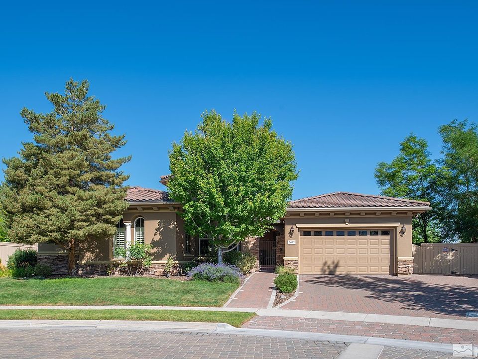 Discover unparalleled beauty, dramatic sunsets and extreme privacy in this exquisite single-level home nestled in the gated community of Damonte Ridge. Breathtaking Mountain Views everywhere. Dramatic sunsets to awe you. Boasting over half an acre on a serene cul-de-sac, this former model home impresses with its many upgrades and stunning outdoor amenities. A private park-like backyard, featuring mature landscaping with trees galore with a colorful variety of shrubs and flowers to envelop and enchant you., Adorned with premium finishes and upgrades at every turn, revealing elegance and comfort throughout. The backyard is an Entertainer’s dream, which was professionally designed and landscaped. Home recently painted; hand rolled with 2 coats. Features include an expansive pergola for shaded relaxation, an inground spa and fountain for ultimate relaxation, built-in BBQ area for outdoor dining, children’s play area (or bocce ball court) for family fun. Very large paver patio, perfect for gatherings. Year-round beauty consists of gorgeous bushes and trees offering a kaleidoscope of colors from spring to late fall, creating a tranquil retreat. Backyard is expansive enough for a game of catch, frisbee, soccer practice, and other activities with your kids, and friends. Motion-sensor lights in rear and side for added security. There is a locking, gated courtyard at front entrance to the home for added privacy and security. Over 3000 sq ft of spacious well-designed living space with 3 bedrooms, 3 1/2 baths with each bedroom having its own private bath, bonus room for office, workout equipment, or other, separate built-in computer work area, formal dining room which can easily used as multi-purpose, large family room, gourmet kitchen complete with nook, breakfast bar, island, walk-in pantry, custom cabinetry, stainless steel GE appliances and tons of counter space. Triple-layered bullnose finish on granite countertops with naturally embedded amber adds extra elegance and uniqueness. Master bath has jetted tub, large walk-in shower, double sink, mountain views. Separate laundry room with sink and cabinets. Additional amenities in the home include a custom entertainment center to accommodate TVs up to 75” and all of your stereo and video equipment, 4 sets of brand new Anderson French Sliders leading to backyard from multiple rooms to take in the scenery and let in loads of natural light, additional French sliders lead to the courtyard from 2 sides, letting in additional natural light. Two Fireplaces. Custom inlaid floor medallion in entryway and custom inlays throughout the hallways complement the medallion design. Brazilian cherry wood flooring in kitchen, porcelain tile and upgraded carpet, built-in surround sound for movie-watching in family room, ceiling speakers throughout the home, including the courtyard and backyard patio speakers, with individual volume controls in every room. Coffered ceilings, some with added wood beams, luxurious double-crown moldings in Master and additional bedroom. Rich wood shelving in Master allows for a beautiful display of your personal treasures. Tons of storage including extra overhead storage racks installed in garage. Whole home water softener with chlorine filter. Extra wide driveway will accommodate 3rd vehicle and leads to a separate gate, should owner want to store another vehicle behind gate (not to exceed gate height per CCRs). Driveway and walkway have paver lights to go along with landscape lighting for nighttime ambience, all on timers. This home is truly a gem that will make any buyers' dreams come true. Prime Location: located in the highly desirable Damonte Ranch area, close to schools, parks, and shopping, with easy access to major transportation routes. A few minutes walk to walking & biking loop around adjacent wetlands just outside community gates. These wetlands prevent any development which could obstruct your views, Close to Mt. Rose and Lake Tahoe ski and resort areas. S