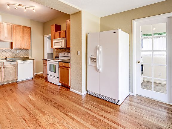 Fenced private patio, spacious kitchen with hardwood floors, laundry room with stacked washer/dryer.