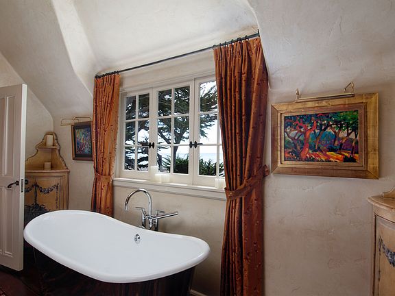 Built in 1931, this Hugh Comstock historical 4BR/4BA home has been exquisitely remodeled with no expense spared. Just moments from the beach in its coveted Carmel Point location, the gorgeous woodwork, gourmet kitchen, English gardens, separate guest house, ocean views, & meticulous attention to detail throughout make this an elegant, even magical retreat. Entering through the enclosed front courtyard with its magnificent outdoor stone fireplace for warm evening gatherings, you hear the sounds of crashing waves & smell the ocean air as you take in this enchanting Carmel home situated under a canopy of mature cypress trees. Take in the crashing waves from the master suite master suite. Even the master bath soaking tub has a view of the sea.