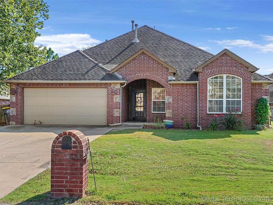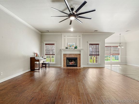Beautiful home in a great neighborhood conveniently located in Coweta school district. The covered porch provides a weatherproof entry into a tiled foyer continuing to the welcoming living room with a wood burning fireplace flanked by large windows creating a cozy environment. The living room, kitchen and dining area are in an open plan. The kitchen features an eat at bar, pantry and good prep space. Three bedrooms and a hall bath are in a split plan from the primary suite allowing privacy yet conveniently all on the main floor. Upstairs you will find a large game room with a full bathroom. The back yard is a nice size with the benefit of a covered patio as well as an open patio adjoining a maintained vacant lot. The whole property is a great space for comfort, relaxation and entertaining.