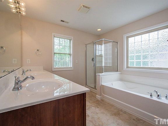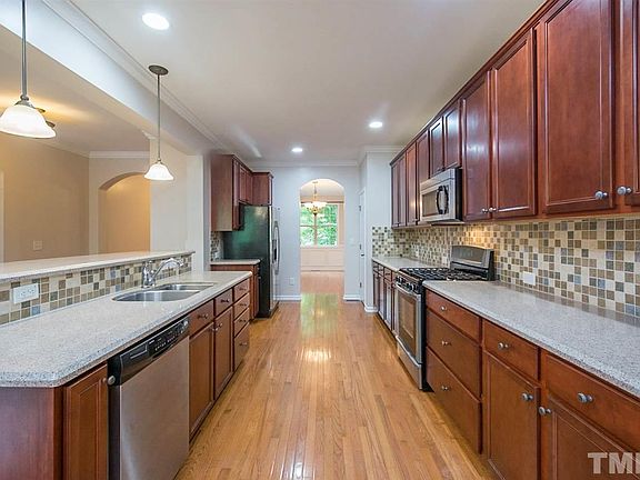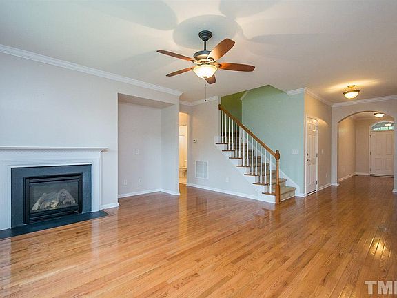 This Raleigh two-story home offers hardwood flooring, stainless steel appliances, a fireplace, a covered deck, and a two-car garage.