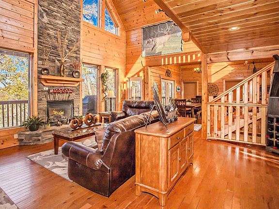 MASSIVE 4BR LODGE WITH MTN VIEWS! Rental company projections based on similar properties between $85-90k! Turnkey and ready to go! Enjoy living the Smoky Mountain Dream! This lodge overlooking the mountains in a wooded setting is top notch and sure to please! Sold furnished and turnkey ready for the rental program. Interior features include soaring vaulted all wood ceilings and walls, spacious living room with floor to ceiling stone fireplace that has the "wow" factor. The fully equipped kitchen features all stainless appliances, an island with additional seating, and a dining area. Multiple levels of covered decking for relaxing and enjoying the serenity the mountains have to offer. You will not find another luxury lodge like this one that has FOUR Master Suites with jet tubs (tile surrounds) and bedrooms on each level with their own private deck access. The upper level also has a loft area that overlooks the living area and has room for bunk beds, more games (has foosball), futon, etc. More room to entertain in the lower level gameroom with pool table/media room. Located in an upscale subdivision minutes to Pigeon Forge, Dollywood, area attractions/shows, shopping, and Gatlinburg/Smoky Mountains National Park. Great property for overnight rental, second home, or permanent living. Plenty of parking in the pull through driveway and a nicely manicured lawn. This is a must see! Call to schedule your viewing today!